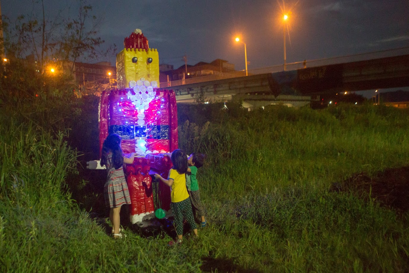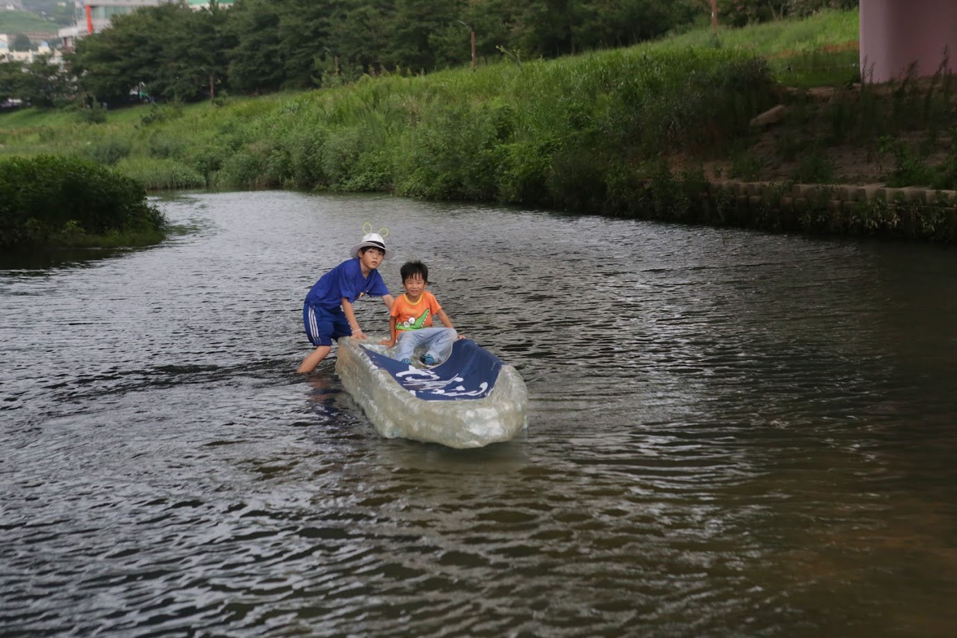 Developed as 2017 ECO ART TRIP — 엄마야 누나야 강변살자, the project took place along the lower section of Daecheoncheon Stream, an urban ecological waterway in Buk-gu, Busan. It approached the stream as a lived site of environmental reflection and public encounter, focusing on plastic waste and biodiversity through a site-specific collaboration that wove together environment, local community, technology, and art. At the center of the project was an eco art journey structured around Bluetooth beacon and location-based mobile content. Participants encountered upcycled installations along the stream, accessed ecological stories and field data through their smartphones, and moved through the site as active participants rather than passive viewers. The project unfolded across months of community process: a BioBlitz ecological survey conducted with local naturalists in May, a Green School upcycling workshop with youth in June, and an interactive ECO ART Boat — built from plastic PET bottles and equipped with solar panel, LED, speaker, and IoT connectivity — that responded in real time to audience presence. Artworks in video, sound, painting, and webtoon, derived from the BioBlitz, were installed as beacon-activated content throughout the site. Living Along Daecheoncheon expanded the ECO ART TRIP methodology into a more community-rooted and technologically mediated public practice, continuing the project's sustained inquiry into ecological futures through participatory art.