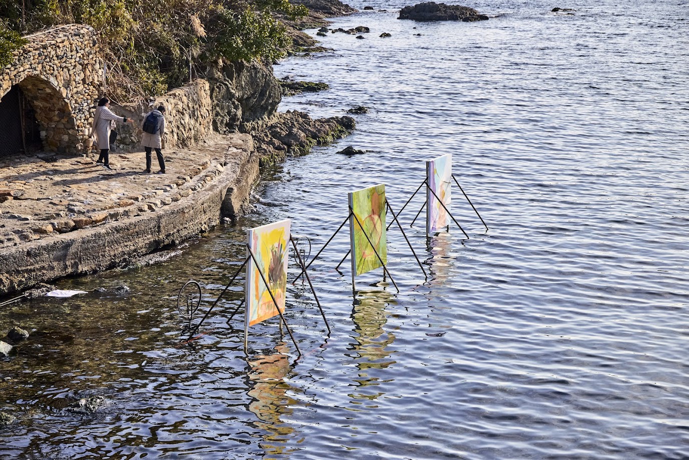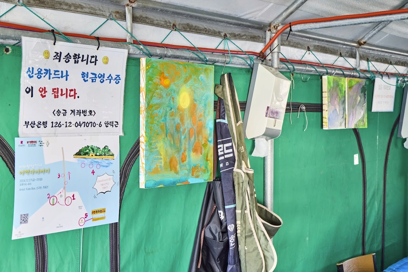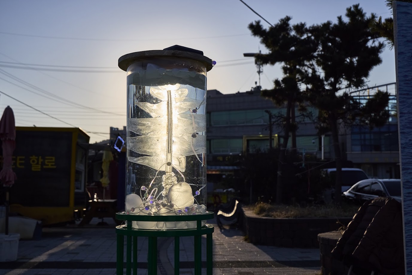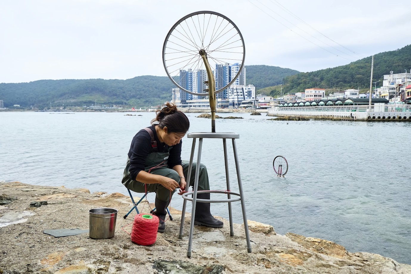 Seaweed Diary began with Gijang kelp, once prized in Korea and now increasingly threatened by rising sea temperatures. The project approached this not only as ecological loss, but as a question tied to food, birth, memory, and the intimate rhythms of human life. Gijang-type kelp was cultivated directly in the sea and followed over time before being translated into visual art, interactive media, and text. At the center of the project was Bicycle Wheel as Housing for the Seaweed, a cultivation structure at Yeonjuk Bridge that invited sustained attention toward a living organism. The work culminated in a popup exhibition in Gijang, with related presentations at the Seoul Design Festival and UN COP29 in Baku. Rather than treating kelp only as a species under threat, the project asked what else disappears when the seaweed dissolves.